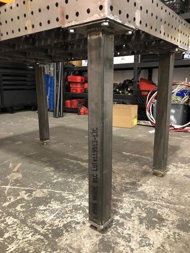 - LEG KITS ARE SOLD SEPERATELY AND COMPRISE OF 2"X 2" OR 3"X3" HSS TUBE LEGS WITH AN UPPER BOLTING PLATE, LOWER WELDED PLATE WITH ETCHED HEX DETAIL FOR AN ADJUSTING NUT THAT WELDS INSIDE THE TUBE SO YOU CAN THREAD A .750" OR 1.0" BOLT IN FOR ADJUSTABILITY FOR UNEVEN FLOORS.